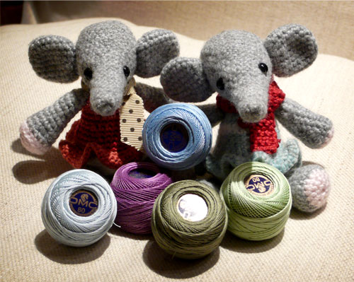 Here’s my little stash, modelled by an elephant duet. The elephant on the left is going to a new home next week, and she’s most excited. (I *love* making things for people. I’m already excited at the thought of packaging her up. I hope her new owner(s) like her).