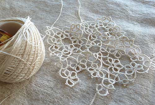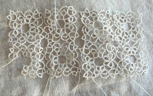 I’ve been tatting a lot on the bus and train recently. I decided to work on something that had the possibility of becoming a larger piece, while still being portable and easy to memorise. I have a terrible habit otherwise of not having a pattern in mind to start, and then faffing about – taking forever to find one, and in the meantime sitting bored, on the train…