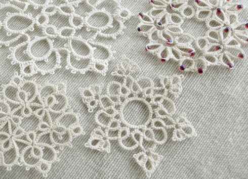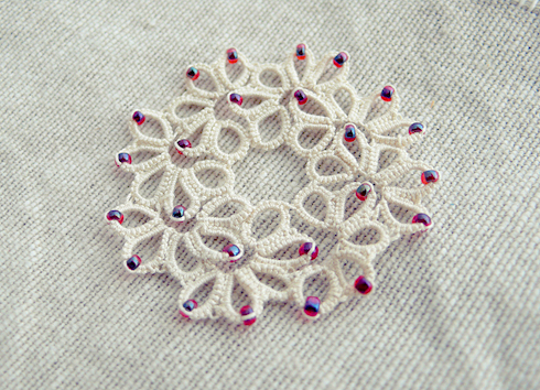 As it happened, I had some spare (size 80) thread on a lone shuttle that I needed to use up. So I *had* to make one of these really. And for the first time, I’ve used beads! I really like it actually. Looks a bit spiky in real life – like a snowy holly wreath. Umm, I also had another shuttle of thread to use up so I’ve got another one on the go, with different beads. They’re coppery, and really pretty. Next year though, must find an addiction for a different pattern, this is getting silly.