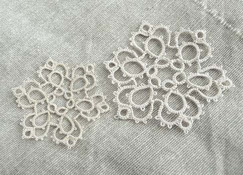 This is one of Jon’s patterns. The left is size 80 and the right is size 40. (I made another of Jon’s patterns in size 40 too, but I’ve sent it out already). I dunno. I’m just not sure about tatting with thick thread. For some reason I just don’t enjoy the feel of it so much. Everything just looks gigantic! I’ve got a few things in mind to try next (like clunys, which always get twisted at size 80), but on the whole, while my eyes are able to cope with it, I think I’ll stick with smaller thread, I’ve got used to it now.