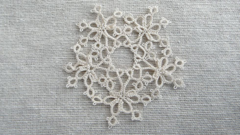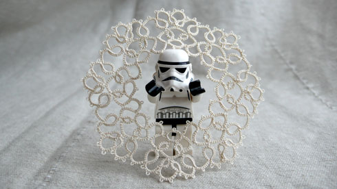 What with all the quilt euphoria, you might think I’ve not been tatting, but I’m still clicking along in the background. When I can get a seat on the train I always tat – it’s a bit like meditation for me. Stops me getting angry that the trains are always late, and gives me time to mull over the day ahead or just gone. Sadly, the above Storm Trooper refused to sew in the ends, and so I had to finish this off alone. The pattern is from here, and I must admit, does benefit from some beads or other embellishment. It’s a bit plain as it is. (The Storm Trooper helps.) I’m tempted to make it in green though, with red beads, as it does make a nice little holly wreath. Perhaps nearer Christmas.
