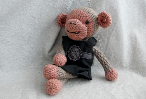 Usually I put scarves on my monkeys, but today, with sore fingers, I couldn’t face crocheting anything else. Out of the blue I decided to make a dress instead. The monkey is actually an odd colour in real life, and just as I was about to chop up some linen, my head said ‘umm, you’re doing this in a rush, with no idea what you’re doing. Use something you don’t care about’. For once I listened and used a bit of old sheet instead. I must admit, I’ve done a dreadful job on the dress sewing! It’s appalling – and worse – the monkey is trapped inside. I had to sew her in, which is something I really don’t like (it’s sloppy, I think). Having said that – Look at her! She’s hilarious. As I sat down to sew her in, I spotted the crochet flower – it’s been knocking about on my desk for ages – I crocheted it in tatting thread a while back.