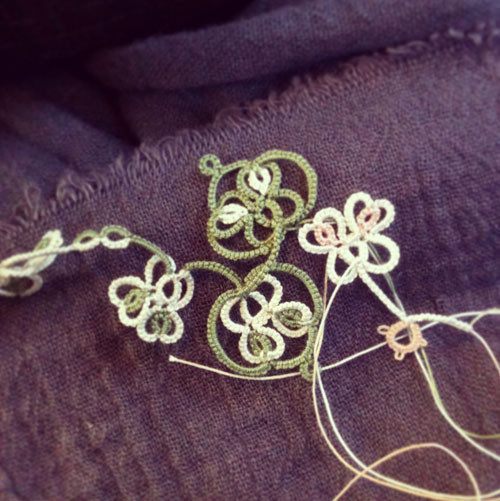Well – as you can probably see, that is not a photo of a quilt in progress –  nor a small crochet bear. It *is* an instagram snap of some tatting, taken on the train. I was sketching a new design, but I’m not sure it’s working. The green and white bit to the left of centre reminds me of snowdrops so that would be the best way to take it perhaps. We’ll see.