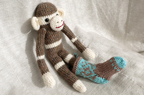 He looks kind of hopeful I think. I’ve said it before, and will no doubt say it again, but the placement of the mouth and eyes is everything when it comes to toys. Get that right and I swear it’s half the battle. And that’s a knitted scarf! The first ever scarf I’ve knitted for one of my toys. This monkey is a gift for my friend’s daughter who is one year old this week. She’s the one I crocheted a blanket for a year ago. I mentioned that it might be an idea for him to sit on the shelf for a bit, as I’m not sure how he’ll take to being chewed, but we’ll see 🙂