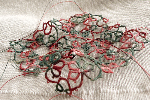 It’s all pretty messy, but I quite like the mix of embroidery and tatting, so I’ll try it again I think. This is the size 50 tatting thread. I think it works well for this kind of thing. I usually tat with size 80, but I think that could be too small. We’ll soon find out as I’m halfway through another version of this wreath.
