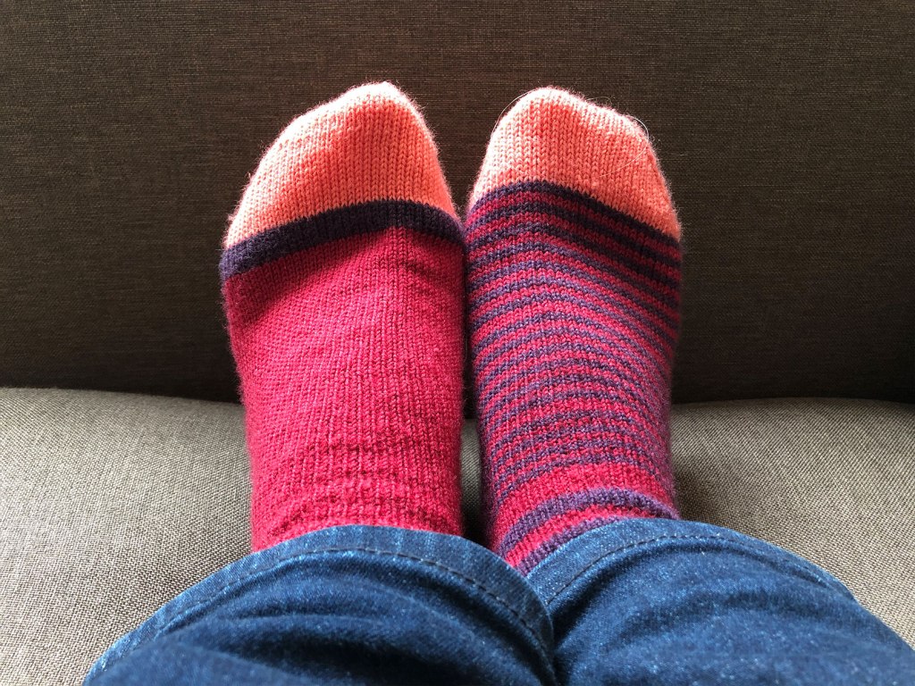 I’d also just finished another pair of mismatched socks last time I posted. I’d bought 3 colours of Cascade Heritage yarn: purple, red and coral. They were an odd colour choice to be honest, but I just liked them when they were all together. And you get a lot of yarn for your money, and 3 colours gives you a lot of choices about what to do with it.