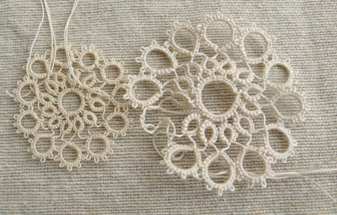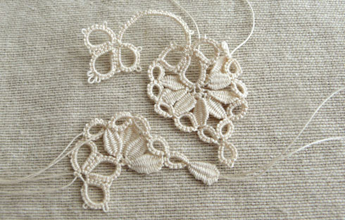 Talking of persevering and stuff that is bigger than expected – I decided to try again with the size 40 thread. Above you can see the same thing in size 80 (left) and 40 (right). I was using up some of the 40 thread I had left on a shuttle (just didn’t have enough to finish this). I’m not in love it with it. It still feels too big for me. That was a test to see if this motif would be more useful in a bigger size – and I’m not sure it would, especially if I don’t like it!